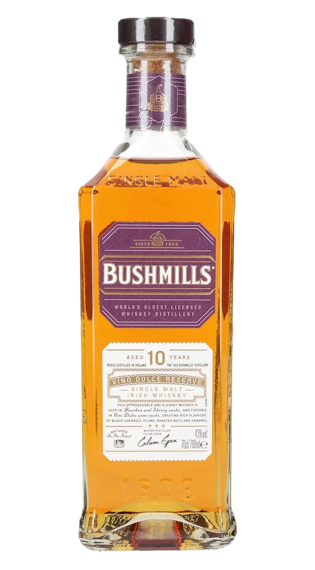 Dieser 10-jährige Bushmills wurde in Bourbon-, Sherry- und Süßweinfässern gereift, was sich auch im Namen Vino Dulce Reserve widerspiegelt. Er wird aus 100 % gemälzter Gerste hergestellt und nach irischer Tradition dreifach destilliert.